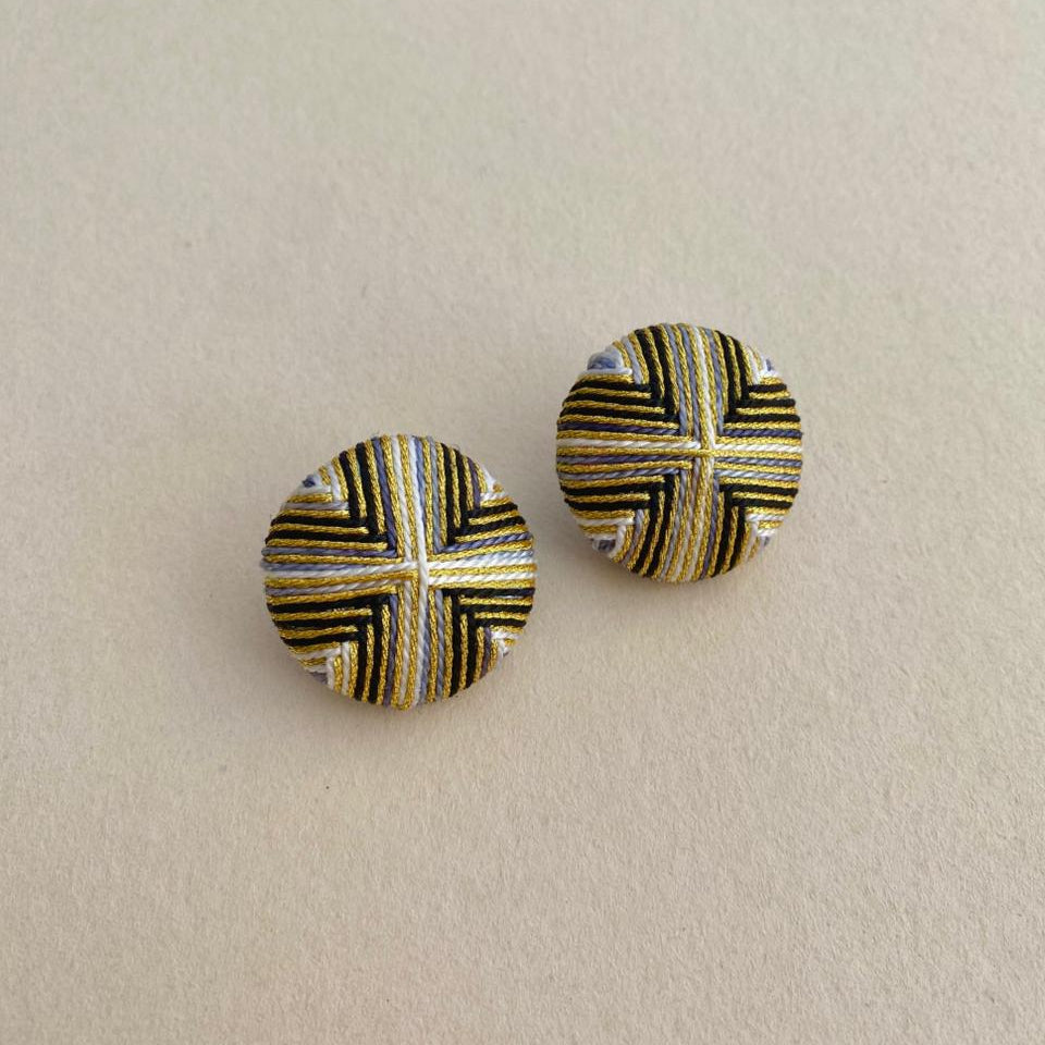 Topos elaborados a mano, con hilos de color, café, negro azul y dorado, tejidos en una base circular.