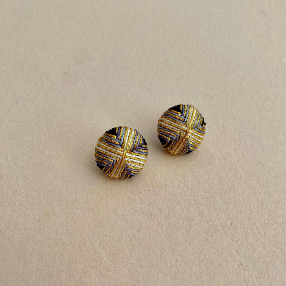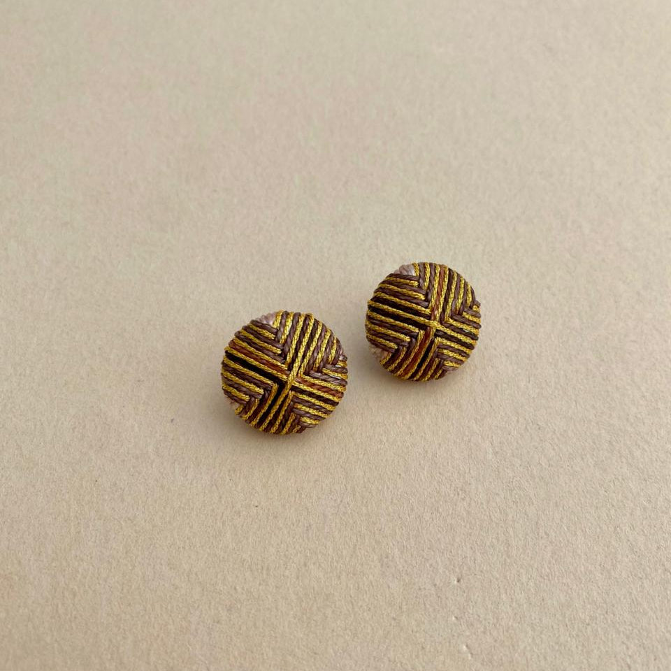Topos elaborados a mano, con hilos de color, café, negro azul y dorado, tejidos en una base circular.